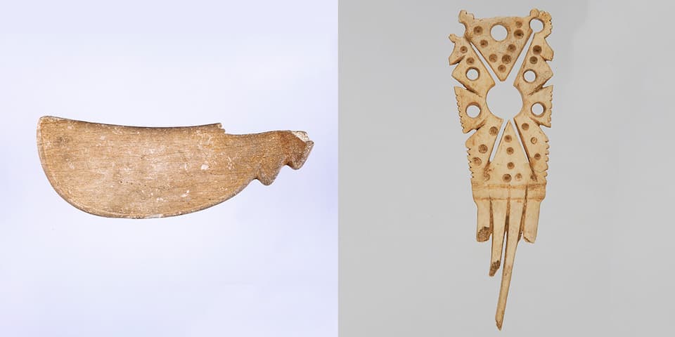 貝塚からはヤマトシジミ、ハマグリなどの貝類をはじめ、スズキ、マダイ、フグなどの魚骨、ハクチョウ、カモなどの鳥骨、シカ、イノシシなどの獣骨が出土しています。また、釣り針や銛などの骨角器も出土しました。中でも、精巧に加工された鹿角製櫛は当時の高い精神性と加工技術を示しています。当時の環境下における食生活や狩猟・採集・漁労などの生業を知る上での貴重な情報源となっています。