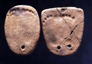 集落内では、竪穴建物による居住域と、土坑墓からなる墓域が分離されており、日常と非日常の空間が区別されていたことを示しています。漁網用の石錘が多く出土しており、漁労が活発に行われていたことがわかります。また、墓には子どもの足を押しつけた足形付土版が副葬されることがあり、この地域特有の精神文化を伝えています。