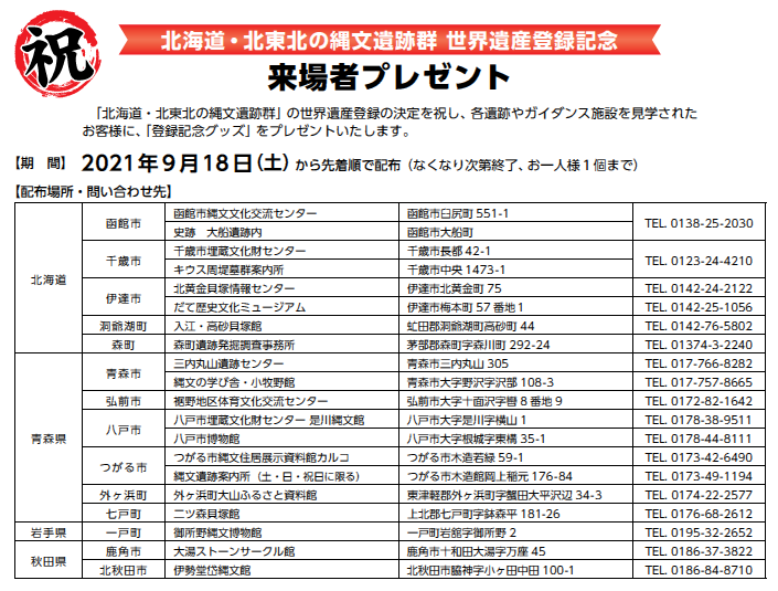 『北海道・北東北の縄文遺跡群まるごとナビ2021』でお知らせしている世界遺産登録記念来場者プレゼント(18ページ掲載)について、令和3年9月18日(土曜日)からの配布を予定しておりましたが、新型コロナウィルス感染症拡大防止に伴う臨時閉館等のため配布開始日が延長となります。