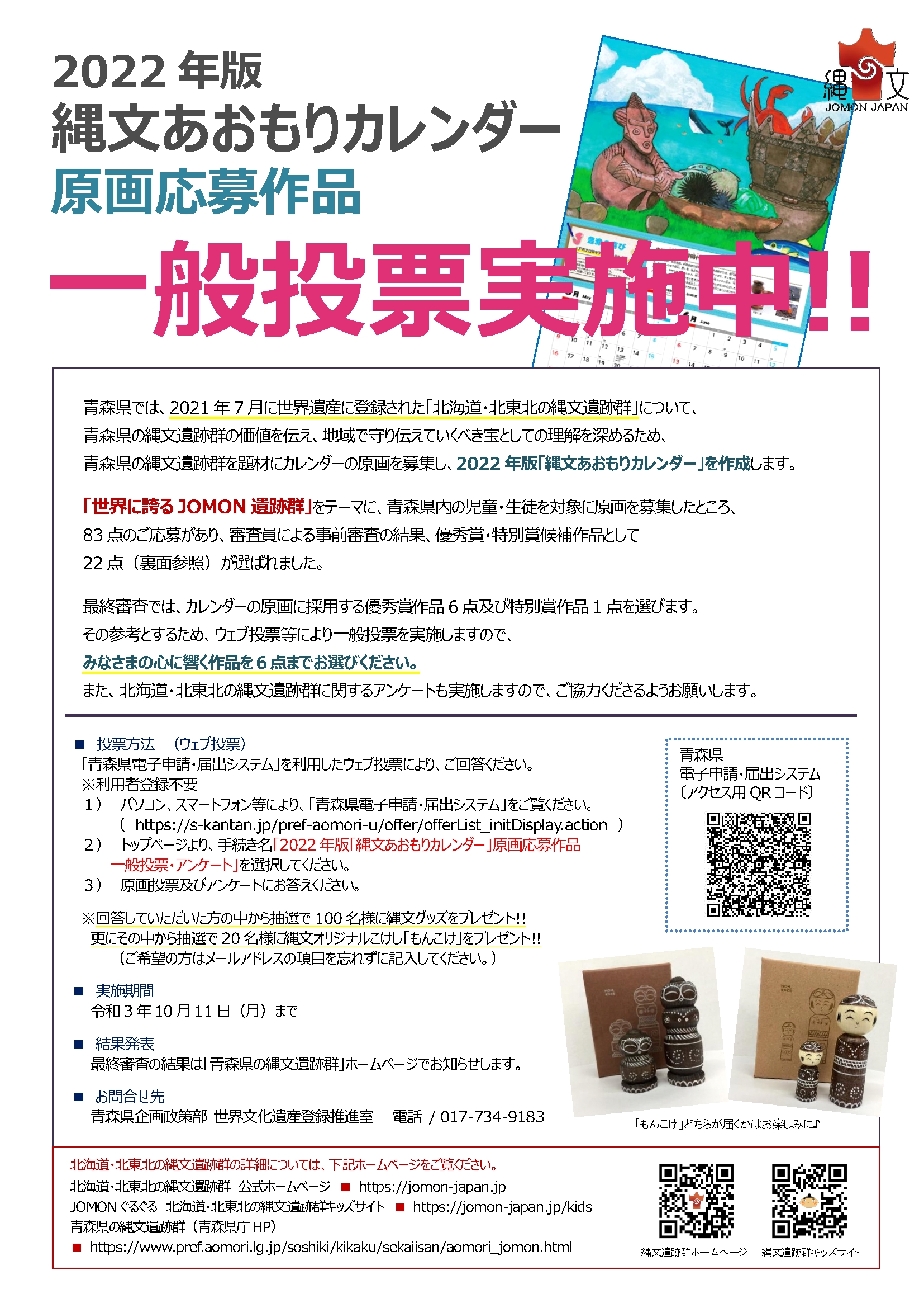 1.パソコン、スマートフォン等により、青森県電子申請・届出システム「2022年版「縄文あおもりカレンダー」原画応募作品一般投票・アンケート」をご覧ください。