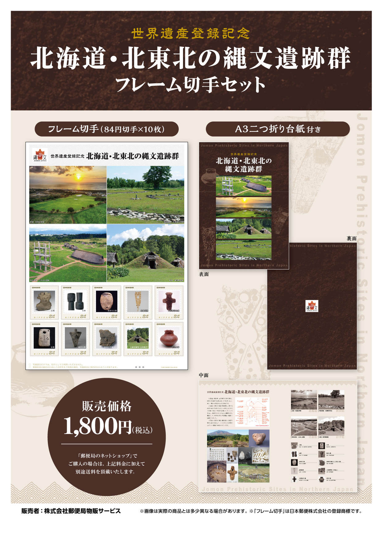 切手セットは、フレーム切手1シート(84円切手×10枚)とオリジナル台紙のセットで、1セット1,800円(税込)です。