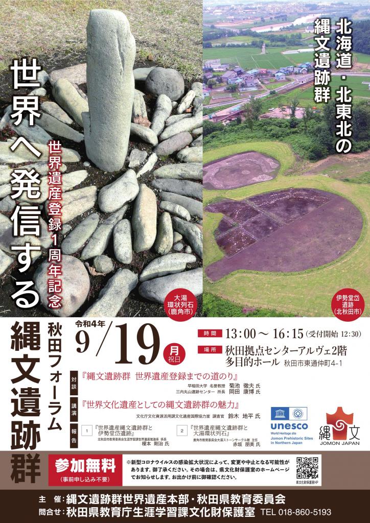 秋田県の大湯環状列石、伊勢堂岱遺跡という2つのストーンサークルを含む「北海道・北東北の縄文遺跡群」の世界文化遺産登録1周年を記念して、9月19日(月曜日・祝日)にフォーラムを開催します。