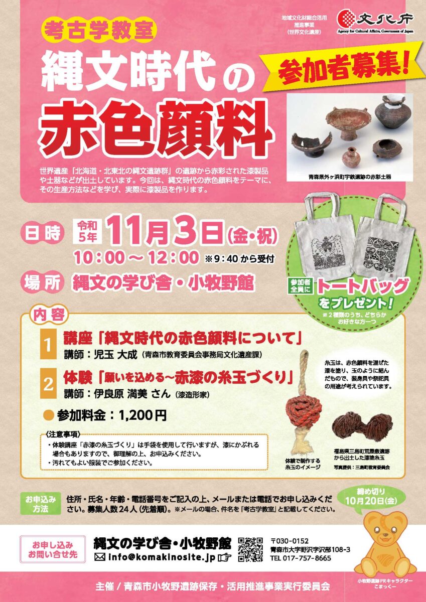 世界遺産「北海道・北東北の縄文遺跡群」の遺跡から赤彩された漆製品や土器などが出土しています。今回は、縄文時代の赤色顔料をテーマに、その生産方法などを学び、実際に漆製品を作ります。
