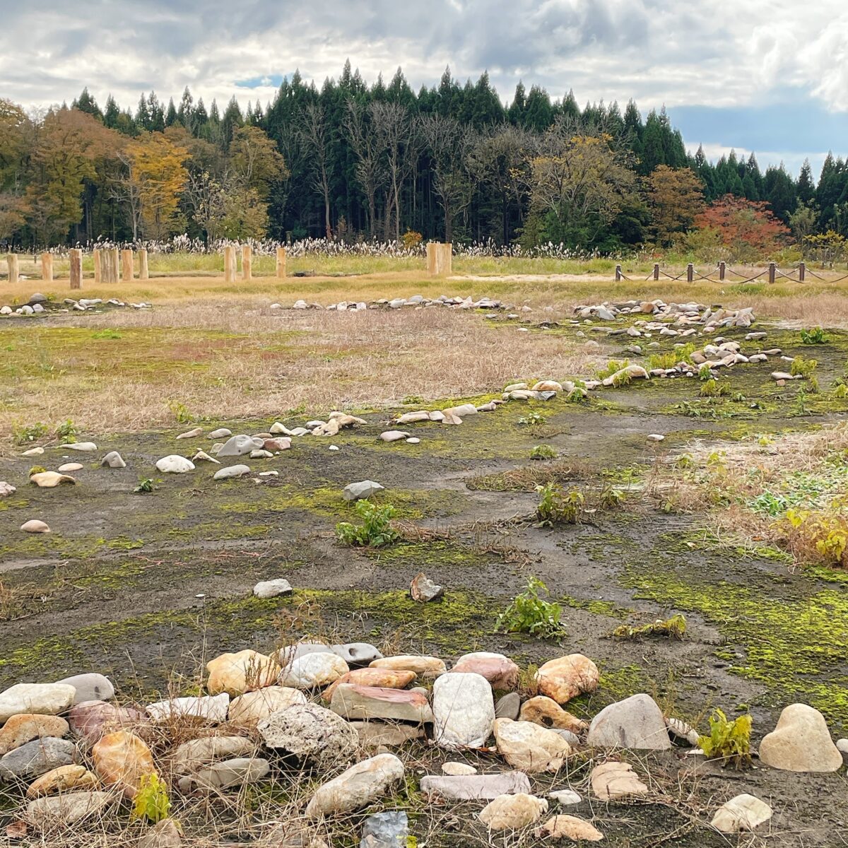 カラフルな石の並んだ遺跡を取り囲む森も、常緑樹の緑と紅葉が色鮮やかでした。