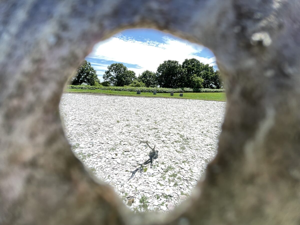 高い2本の木がキウス周堤墓の年月の経過を表しており、そこを歩く子供たちが印象的で撮影しました。