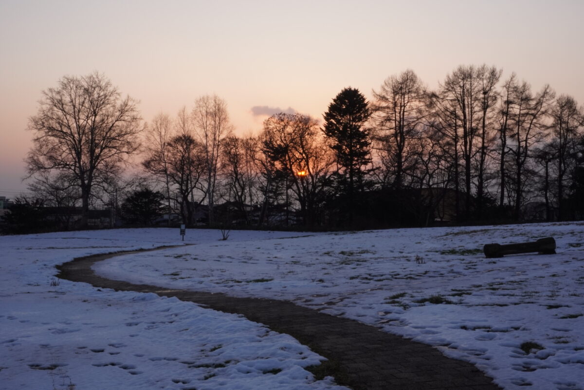 冬の夕方。雪の上には動物の足あとが見えます。