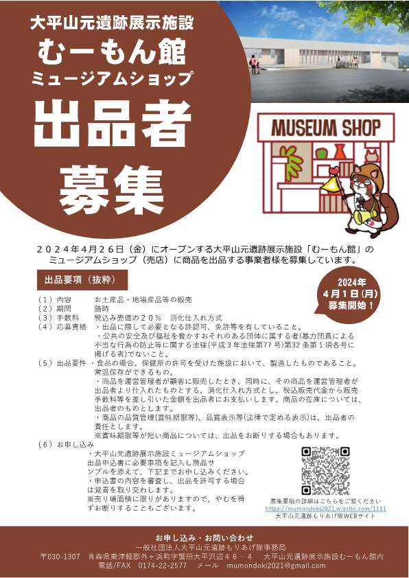 2024年4月26日(金)にオープンする大平山元遺跡展示施設「むーもん館」のミュージアムショップ(売店)に商品を出品する事業者様を募集しています。